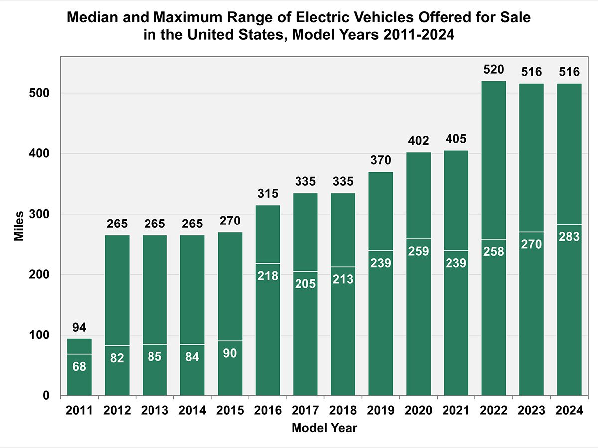 The range for model year 2024 EVs averaged 283 miles per charge, an increase of 13 miles from the previous model year and four times higher than 2011. Currently, the 2022 Lucid Air sedan sits are the top of the EV list, with an EPA-certified maximum range of 520 miles per charge.